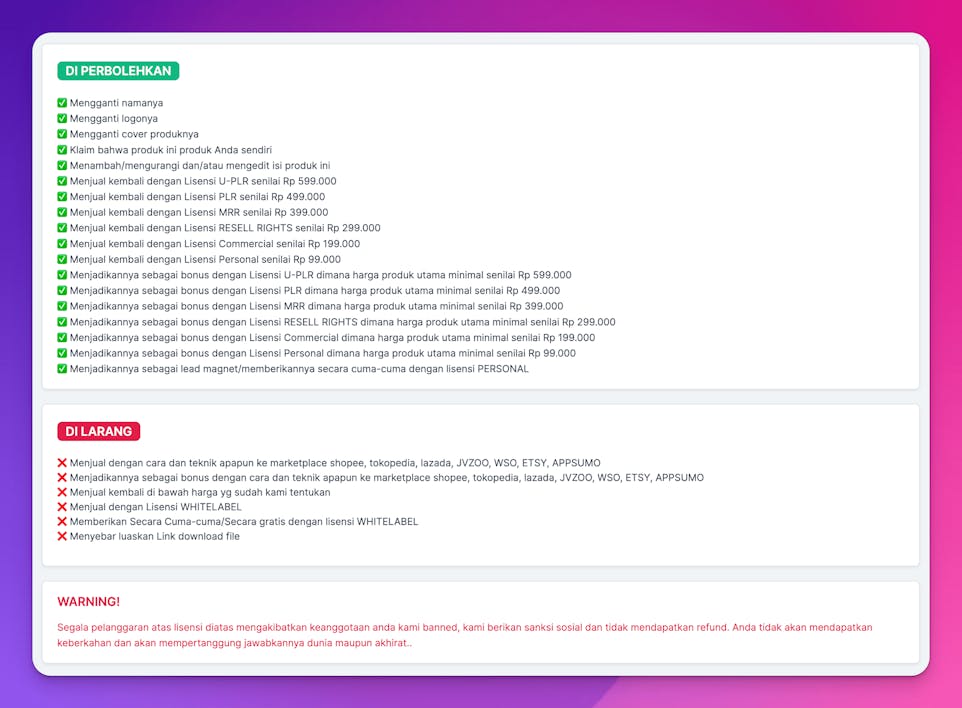 - Boleh dijadikan sebagai Lead Magnet dengan lisensi Personal, Komersial, Resell Rights, MRR, PLR, U-PLR