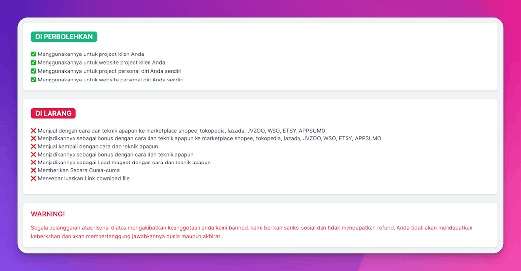 - Bisa untuk digunakan sendiri, gak bisa dijual kembali ke orang lain